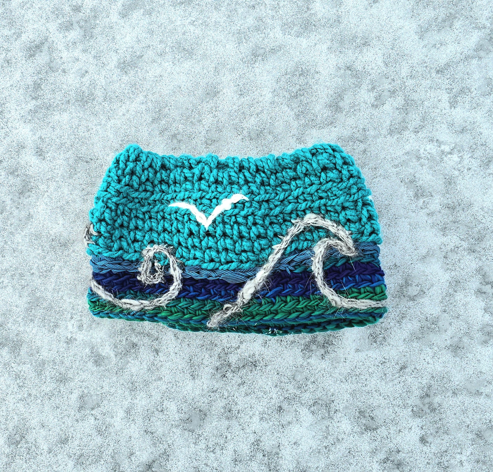 One size. Angora waves and gulls. Pony tail hole on top.
